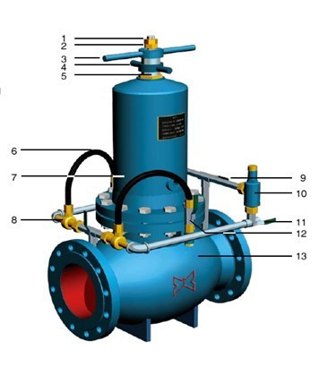 如右圖所示,ZJY46H活塞式減壓閥是由主閥和反饋系統(tǒng)組成。圖中所示為功能代號(hào)④的產(chǎn)品:雙反饋。可反沖排污、內(nèi)鎖定保護(hù)型。
